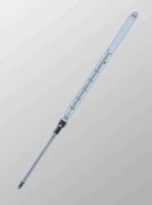 | Описание Термометр для измерения температуры нефтепродуктов при определении условной вязкости (в вискозиметре Энглера). Изготавливается по ТУ 92-887.019-90. Термометр внесен в Государственный реестр средств измерений и имеет «Свидетельство об утверждении типа средств измерений». Конструкция Стеклянный термометр с вложенной шкальной пластиной из молочного стекла. В нижней части, над резервуаром, на корпус термометра насажена металлическая гильза. Термометр неполного погружения. |