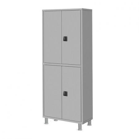 Верхняя и нижняя секции – с двумя металлическими дверцами, оборудованными ригельными замками, и двумя металлическими полками в каждой секции.