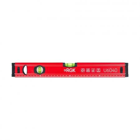 Строительный уровень RGK U6040 оборудован 2 капсулами для контроля положения вертикальных и горизонтальных конструкций. При производстве рабочая плоскость подвергается фрезеровке, благодаря чему становится идеально ровной.